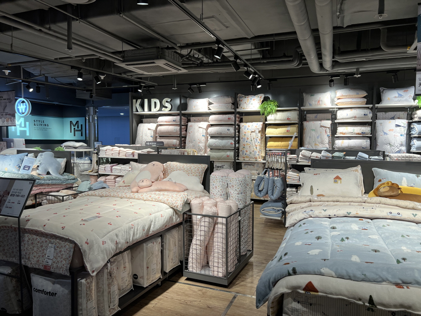 사진에 보이는 곳은 키즈 침구류 코너입니다. 아이들이 좋아하는 캐릭터가 그려진 이불부터 시작해서 애착인형, 베개커버, 등 여러 가지 제품이 있습니다.